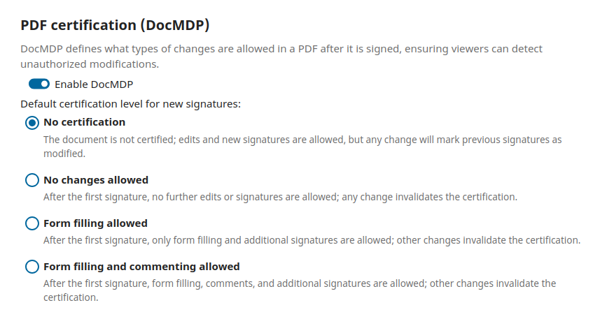 Learn how LibreSign implements DocMDP support according to ISO 32000 standards, providing document protection policies that ensure integrity and control over modifications after digital signature.